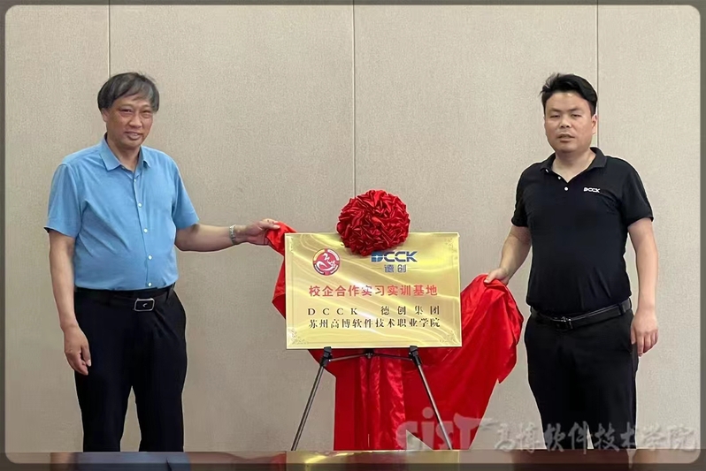 在热烈的掌声中,邹学海副校长和葛大伟董事长代表校企双方签订了校企合作协议,并共同为“校企合作实训基地”揭牌,这标志着学校与德创集团的校企合作拉开新的序幕。